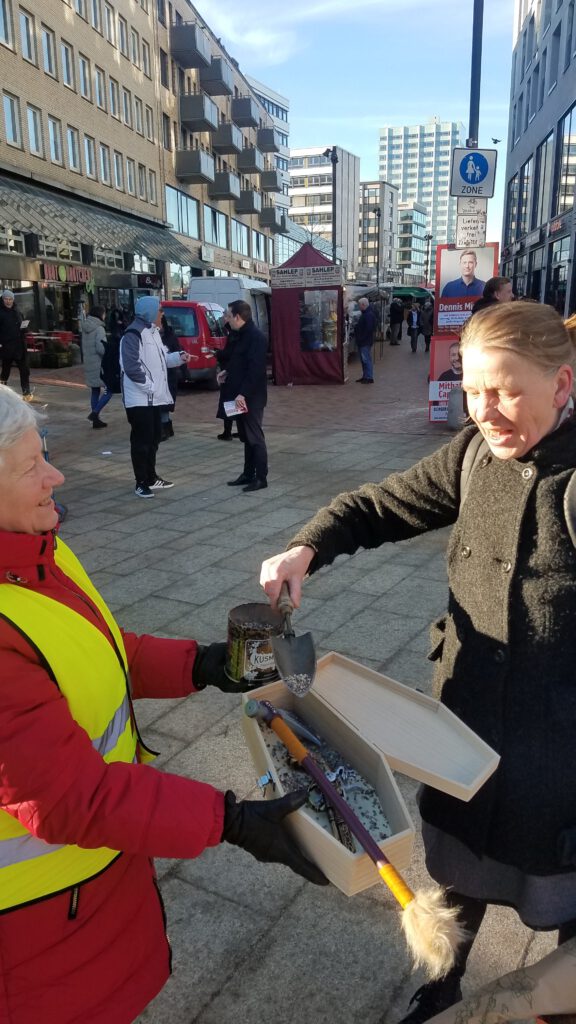Ich habe einige Personen – insbesondere zwei Frauen und einen Mann – kennengelernt, die keine Flugblätter nehmen, sich aber immer mit mir unterhalten. Auch gestern ist es wieder vorgekommen, dass Menschen meines Alters – vor allem Frauen – sich erleichtert äußern, dass sie nun schon ein so hohes Alter erreicht haben. Da kann ich ihnen immer nur beistimmen.