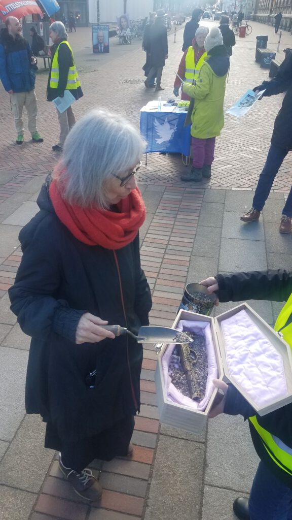Eine vielleicht 70-jährige Frau spricht uns an, ob Hochrüstung vielleicht nicht doch das Richtige wäre, weil sich dadurch nun einmal mehr Sicherheit erreichen ließe.